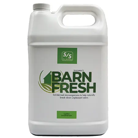 Barn Fresh contains soil-derived microbes and metabolites to naturally break down the proteins, salts, and other materials found in urine and fecal matter that cause unpleasant odors such as ammonia. Use in livestock pens, barns, horse stalls, and anywhere else animals are held.