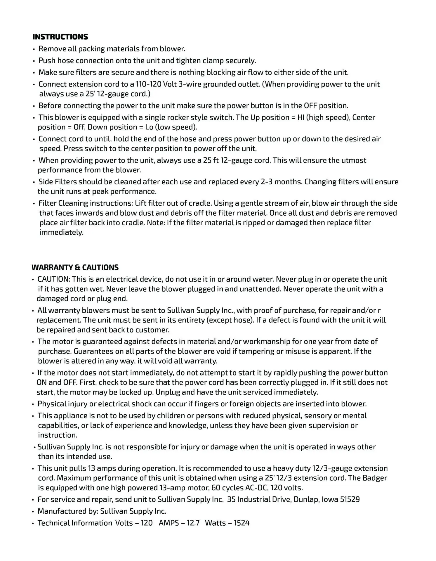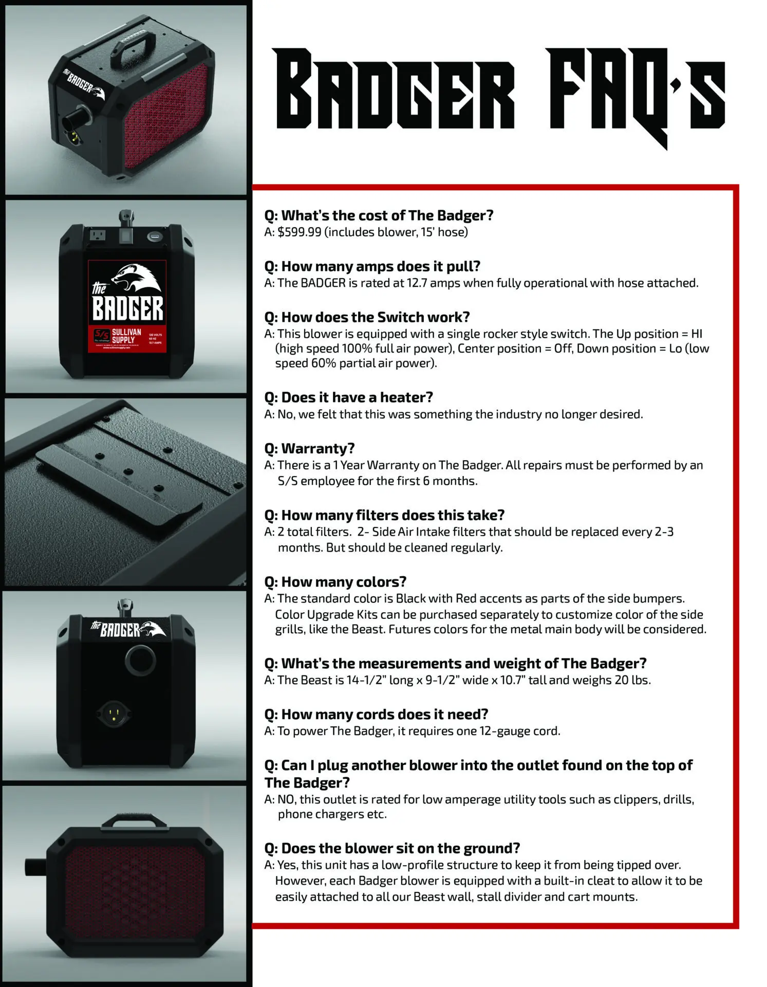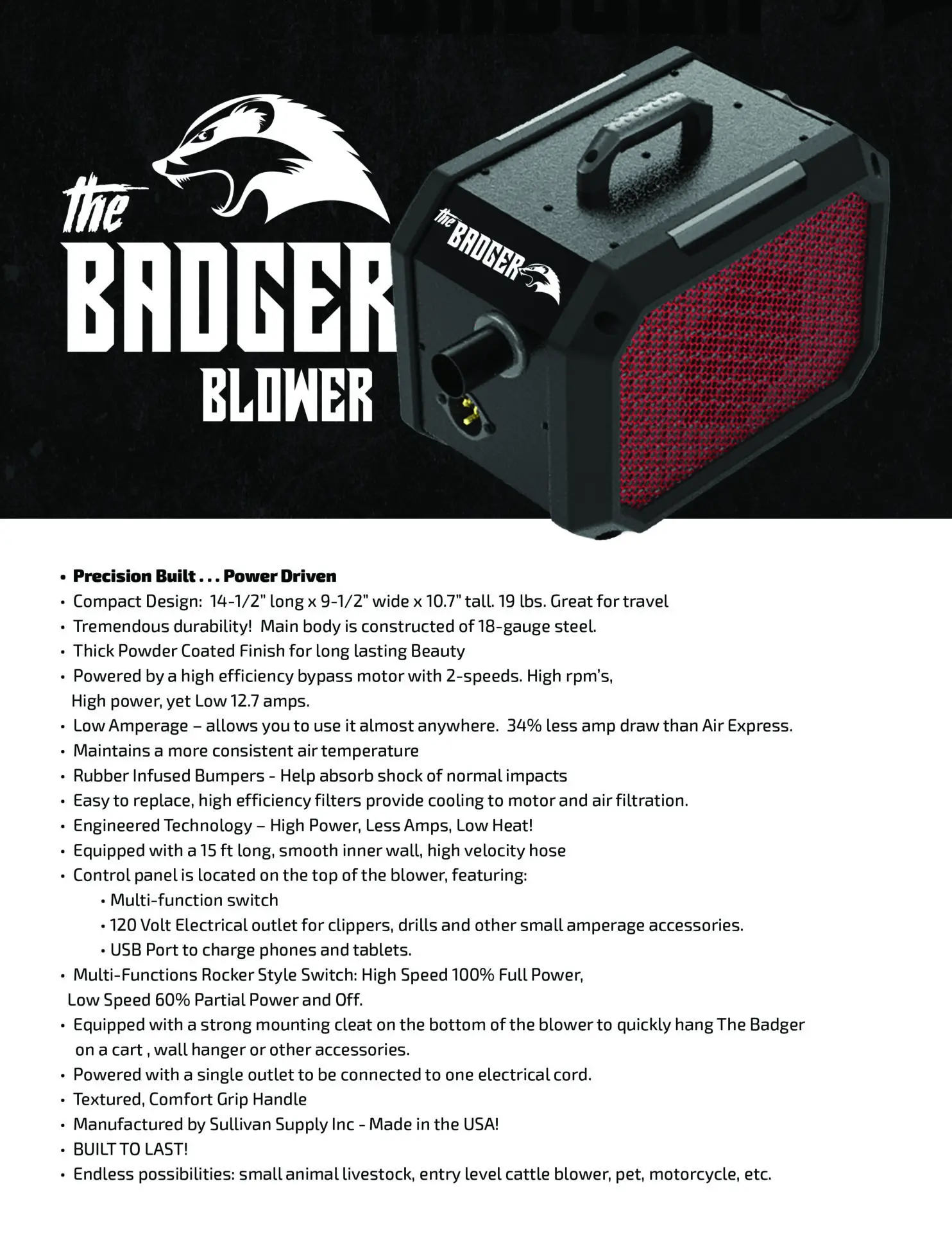 Sullivan’s The Badger, delivers serious punch with a compact, 20-lb frame and a durable steel body. A single 2-speed motor brings Air Express III-level power with 32% less amp draw, making it the perfect grab-and-go blower for cattle, goats, sheep, swine, pets, motorcycles, and more.
