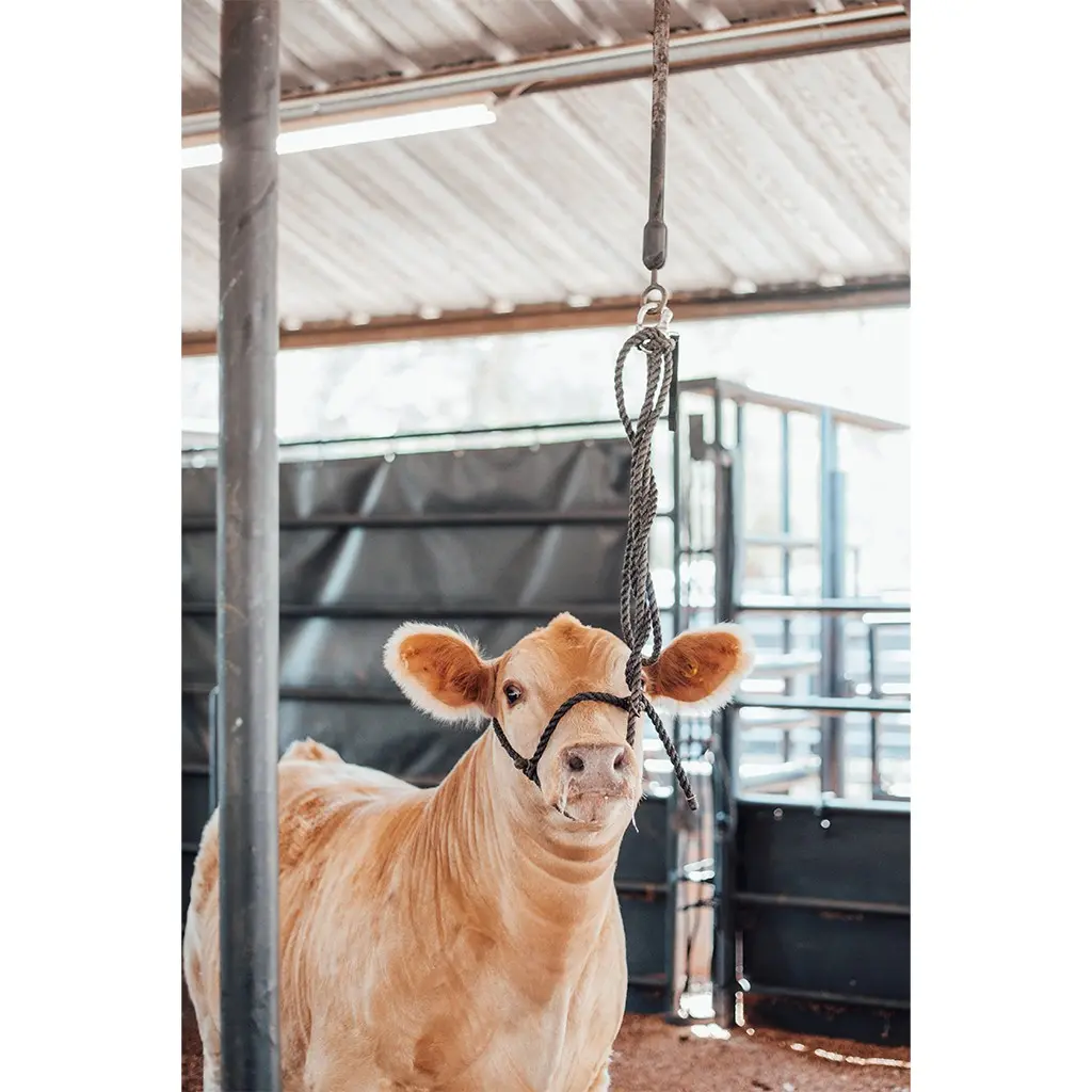 An at-home training tool that teaches cattle to hold their heads up and to stand still without swinging while at the show ring. Equipped with a quick release mechanism to immediately release the animal if needed.